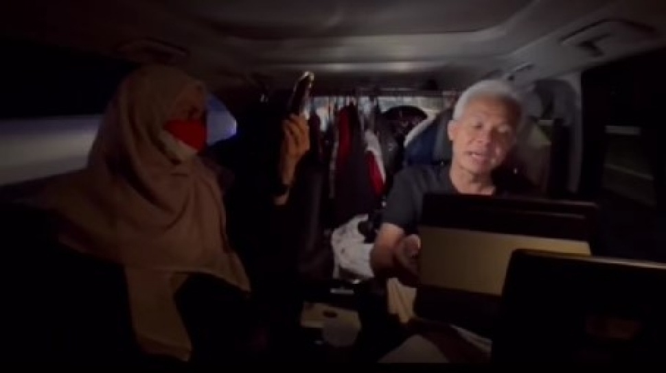 Saat itu, Ganjar Pranowo sedang berdiskusi dengan seseorang melalui zoom di laptop. Mengingat kondisi dalam mobil yang gelap, Siti Atikoh membantu sang suami dengan menyalakan lampu senter dari handphone.