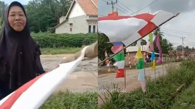 Sebuah video yang viral, salah satunya diunggah akun Instagram @nyinyir_update_official, menunjukkan aksi polos seorang emak-emak yang dengan penuh semangat memasang bendera untuk menyemarakkan HUT RI.