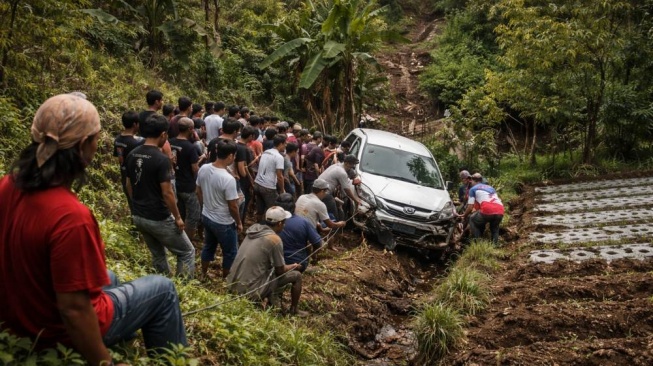 - Kendaraan kehilangan tenaga saat menanjak tajam, menyebabkan mobil meluncur mundur dan terperosok ke perkebunan warga setempat.