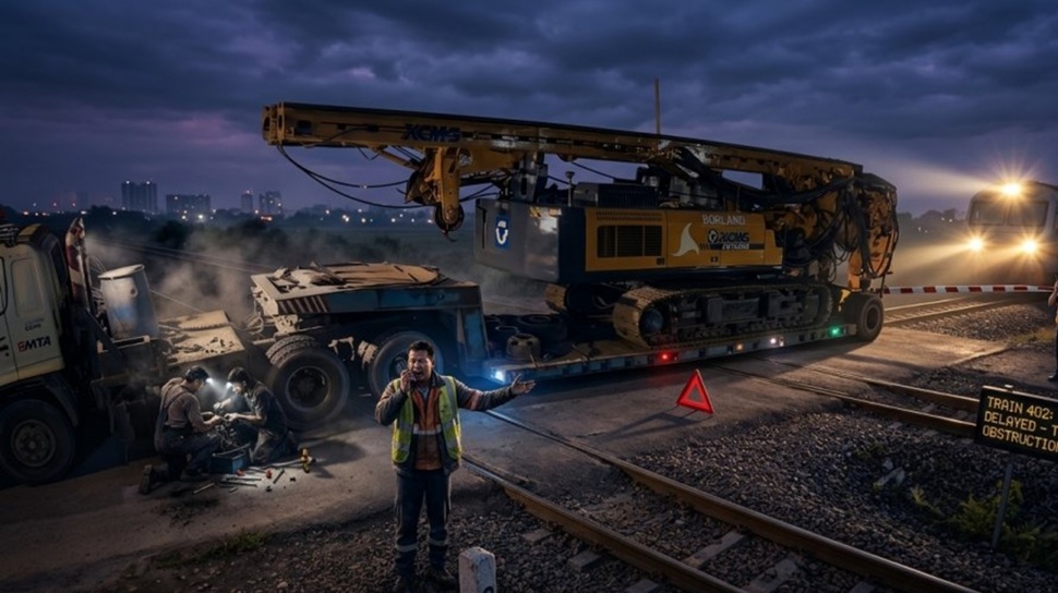 Petugas di lapangan menyampaikan bahwa sebuah truk trailer yang membawa alat berat tersangkut di perlintasan rel. Kendaraan tersebut berhenti tepat di atas jalur sehingga menutup lintasan kereta dari arah hulu maupun hilir.