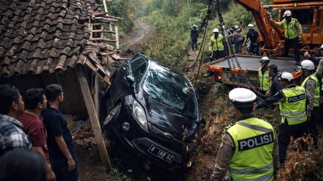 - Pengemudi ibu dan dua anaknya selamat, namun mobil menabrak rumah warga di bawah tepi jalan.