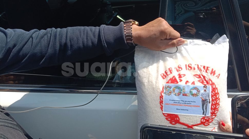 Uniknya, beras tersebut berstiker foto Gibran. Selain itu, terdapat tulisan, “SOLO. Ini saatnya mengerahkan apa yang kita bisa untuk saling menjaga bersama” dan “Kebut Vaksinasi Kebut Pemulihan Ekonomi”.