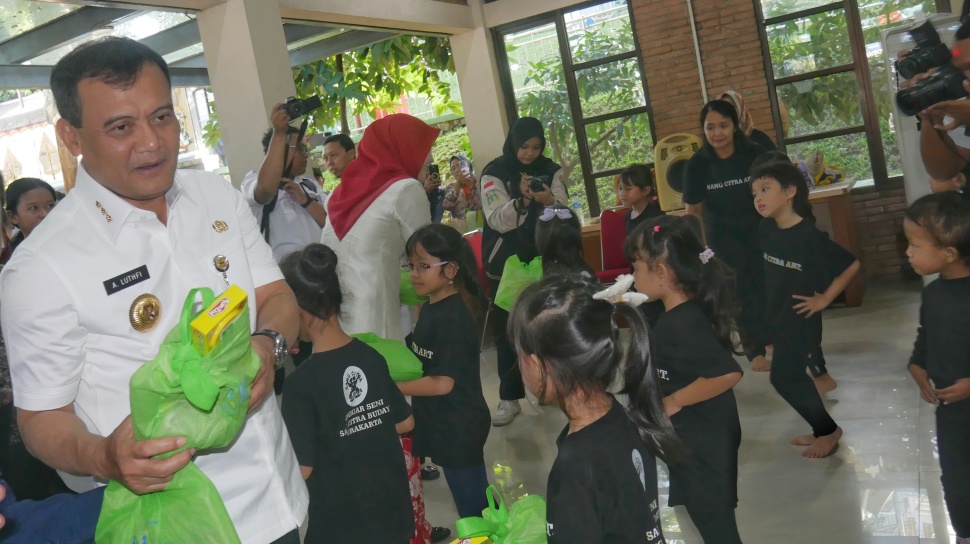 Gubernur Jawa Tengah, Ahmad Luthfi membagikan bingkisan ke anak-anak di Taman Cerdas Jebres, Kota Surakarta, Rabu (23/4/2025). [Istiewa]