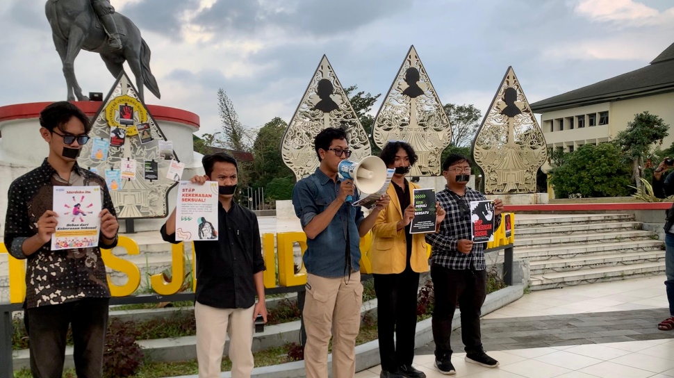 "Tidak ada tempat bagi pelaku kekerasan seksual di ruang akademik mana pun," seru massa aksi.