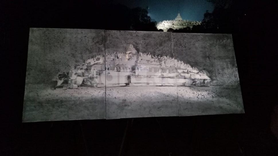 Lukisan Candi Borobudur yang dilukis menggunakan material platina. (Suara.com/ Angga Haksoro A).