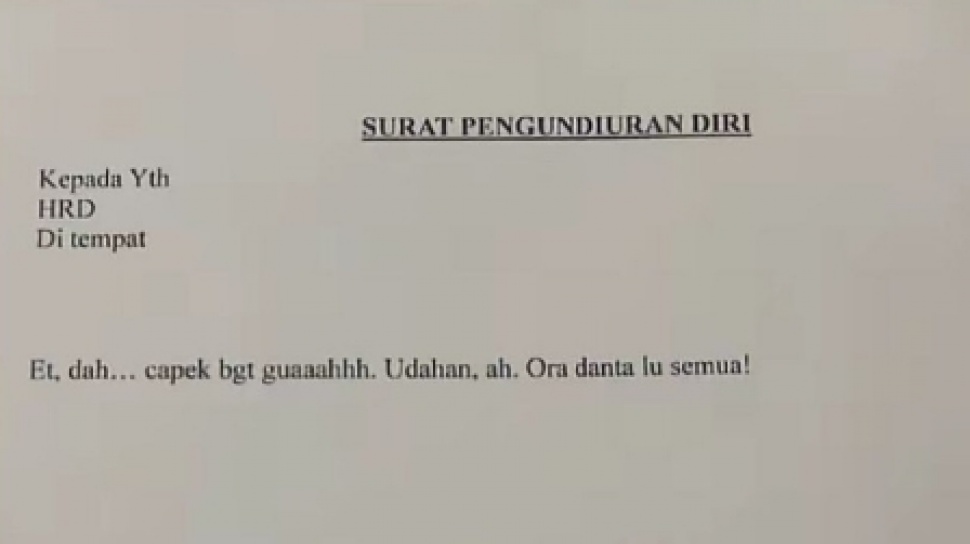 Dalam unggahan tersebut, terlihat secarik kertas dengan kop "SURAT PENGUNDURAN DIRI" yang ditujukan kepada Yth. HRD. Isinya pun di luar dugaan, sangat singkat, padat, dan langsung ke intinya.