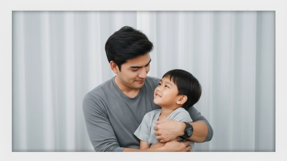 “Gambarkan seseorang berpelukan dengan versi kecil dirinya, wajah tetap asli tanpa perubahan. Gaya studio minimalis, latar belakang putih polos dengan pencahayaan lembut merata. Rasio 9:16, kualitas HD 1080p.”