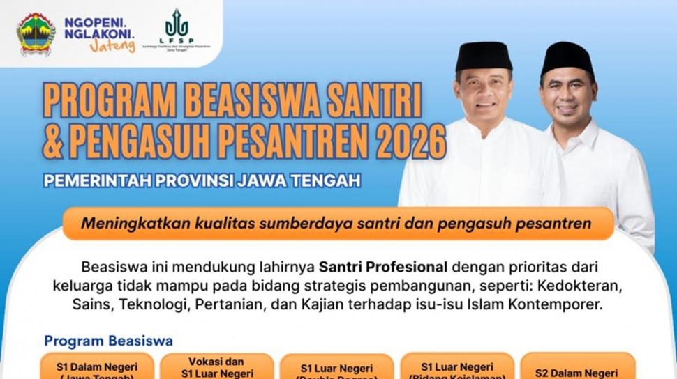 - Pemprov Jateng membuka beasiswa santri dan pengasuh pesantren 2026 melalui program Pesantren Obah.