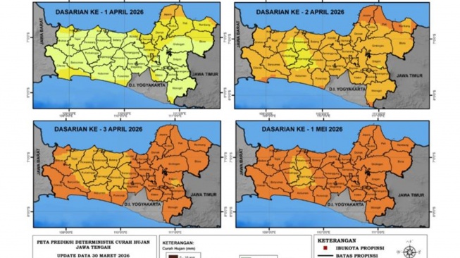 "Dari analisis curah hujan dasarian ketiga Maret 2026 atau periode 21-31 Maret, sebagian besar wilayah Jawa Tengah berada pada kategori menengah hingga tinggi, yakni berkisar 51-300 milimeter per dasarian," kata Teguh di Cilacap, Kamis (2/4/2026).